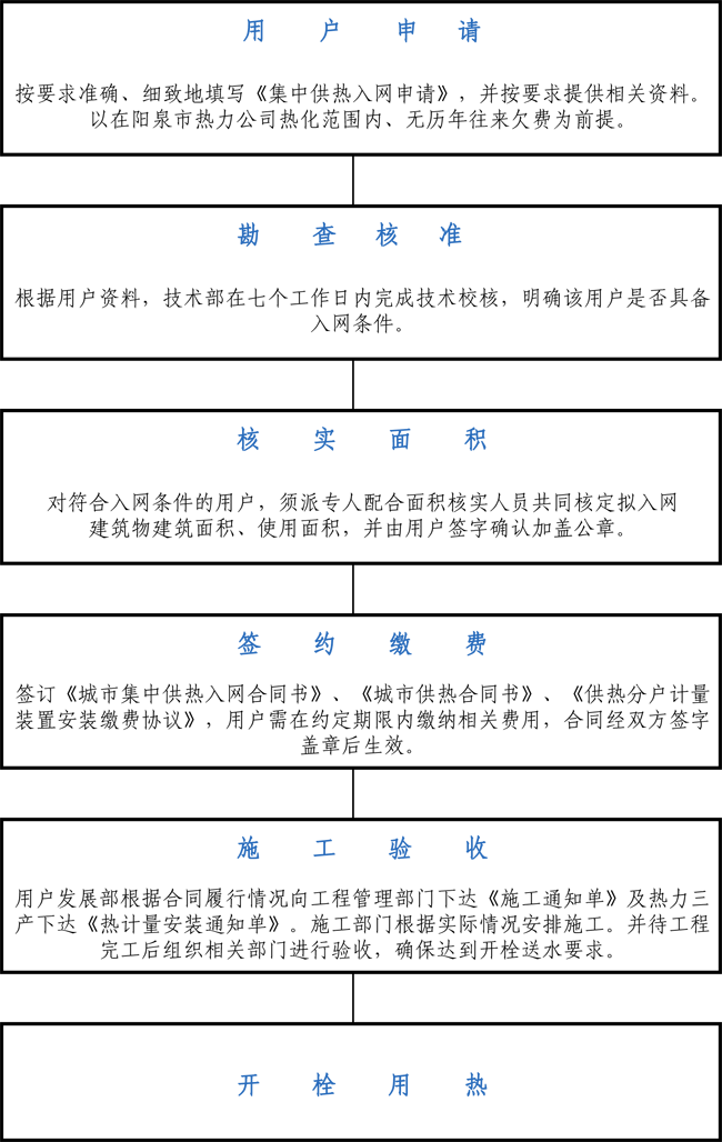2、新增用戶由用戶發(fā)展部負責接待、咨詢、告知入網(wǎng)業(yè)務流程。有意向入網(wǎng)用戶寫出正式書面申請,并準確、細致地填寫《入網(wǎng)申請表》,按要求提供相關資料。須以在陽泉市熱力公司熱化范圍內(nèi)、無歷年往來欠費為前提。